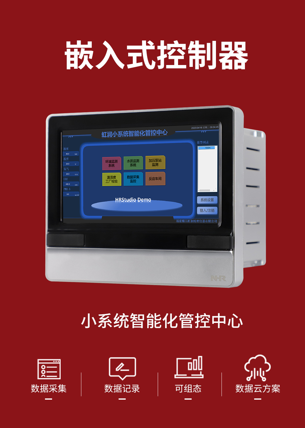 虹潤公司是專業(yè)生產(chǎn)觸摸屏的國家專精特新“小巨人”企業(yè)。生產(chǎn)的嵌入式控制器,具有數(shù)據(jù)采集與記錄,內(nèi)置與外配組態(tài)軟件,數(shù)據(jù)云方案,RS485/以太網(wǎng)通訊等特點。產(chǎn)品獲得嵌入式數(shù)據(jù)采集工作站組網(wǎng)系統(tǒng)、數(shù)據(jù)采集工作站、無紙記錄儀、智能化控制器、巡回檢測顯示方法及裝置等5項國家發(fā)明專利;主持起草通信系統(tǒng)多通道數(shù)據(jù)采集控制終端規(guī)范軍用標準,物聯(lián)網(wǎng)智能記錄儀表通用技術(shù)條件國家標準,以及空間數(shù)據(jù)與信息數(shù)據(jù)傳輸系統(tǒng)等2項航天標準,參與國際5G標準制定;取得嵌入式數(shù)據(jù)采集控制工作站以及HRStudio畫面組態(tài)軟件等4項相關(guān)軟件著作權(quán)。產(chǎn)品廣泛應用于航天航空、化工、冶金、制藥、設備配套、現(xiàn)代農(nóng)業(yè)、環(huán)境監(jiān)測等諸多領域。
