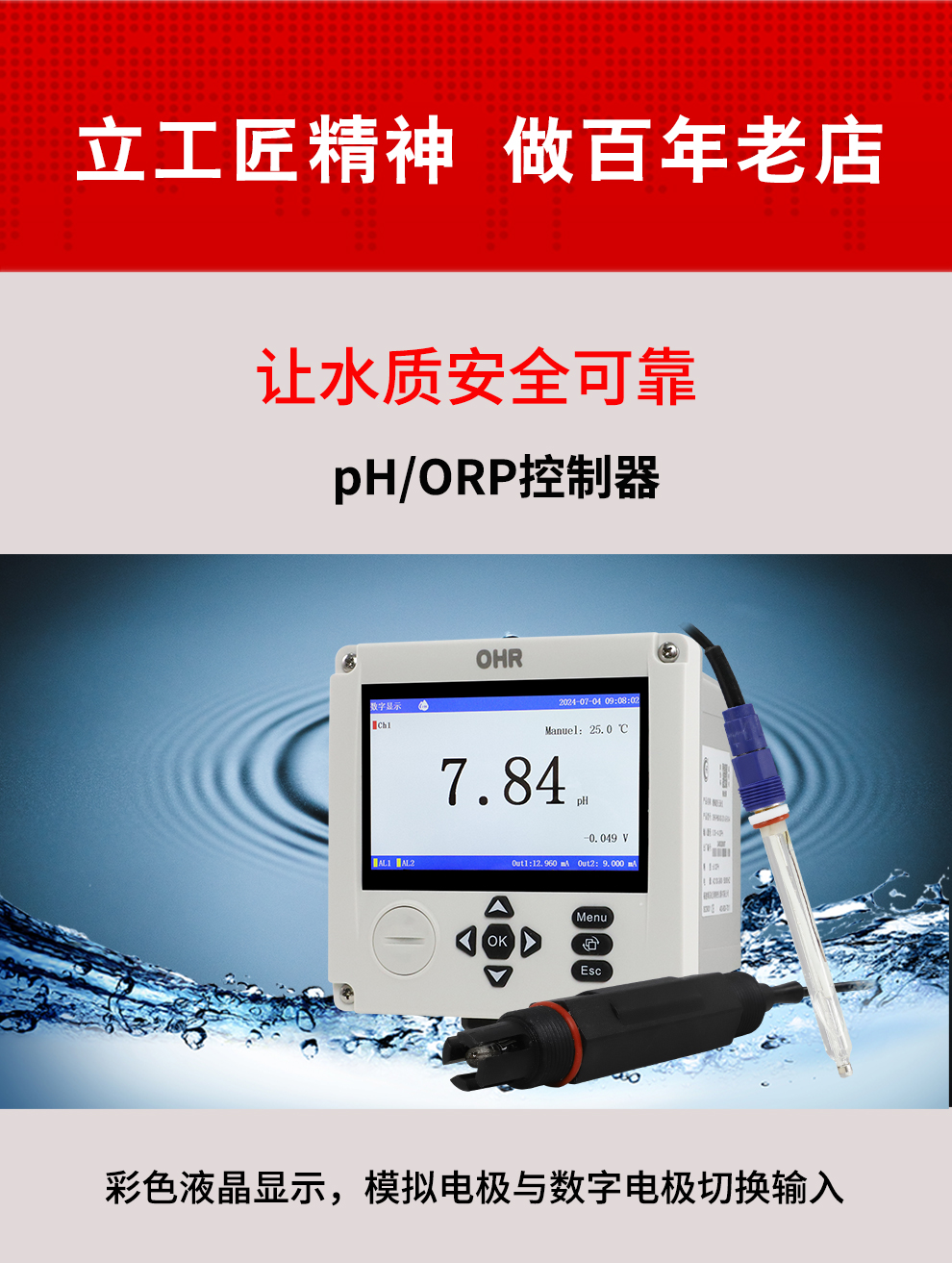 虹潤公司是專業(yè)生產(chǎn)水質(zhì)分析儀的國家專精特新“小巨人”企業(yè)。生產(chǎn)的pH/ORP控制器,具有模擬電極與數(shù)字電極切換輸入、測量精準穩(wěn)定不跳字,RS485/以太網(wǎng)通訊,配套上位機管理軟件等特點。產(chǎn)品獲得一種適應(yīng)性強PH控制儀、一種平板無紙記錄儀、智能化控制器等3項國家發(fā)明專利;主持起草物聯(lián)網(wǎng)智能記錄儀表通用技術(shù)條件、現(xiàn)場設(shè)備工具(FDT)接口規(guī)范、過程分析技術(shù)系統(tǒng)等3項國家標準,以及通信系統(tǒng)多通道數(shù)據(jù)采集控制終端規(guī)范軍用標準,參與國際5G標準制定,取得PH無紙記錄儀等4項相關(guān)軟件著作權(quán)。產(chǎn)品廣泛應(yīng)用于實驗室、水處理、環(huán)境監(jiān)測、食品、制藥、農(nóng)業(yè)、工業(yè)流程控制等諸多領(lǐng)域。