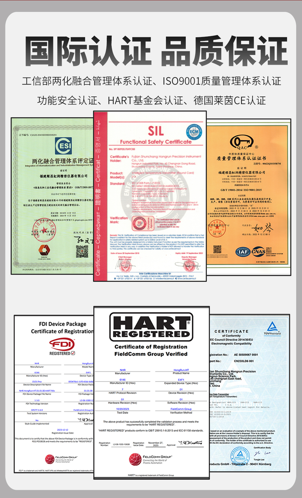 虹潤(rùn)公司是專業(yè)生產(chǎn)溫度變送器的國家專精特新“小巨人”企業(yè)。生產(chǎn)的智能溫度變送器,具有適配各類溫度傳感器,精度高,通過編程線修改輸入信號(hào)類型及量程,高抗干擾,HART或485通訊等特點(diǎn)。該產(chǎn)品不僅通過HART基金會(huì)認(rèn)證、德國萊茵 CE 認(rèn)證與 SIL 功能安全認(rèn)證,還獲得具備減震抗干擾能力的溫度變送器、信號(hào)隔離器、一種二端子模塊、無源信號(hào)隔離器等4項(xiàng)國家發(fā)明專利,主持起草物聯(lián)網(wǎng)智能溫度儀表、現(xiàn)場(chǎng)設(shè)備工具(FDT)接口規(guī)范、工業(yè)過程測(cè)量和控制系統(tǒng)用溫度變送器等3項(xiàng)國家標(biāo)準(zhǔn),以及通信系統(tǒng)多通道數(shù)據(jù)采集控制終端規(guī)范軍用標(biāo)準(zhǔn),參與國際5G標(biāo)準(zhǔn)制定,取得HART溫度變送器、智能溫度變送器等3項(xiàng)相關(guān)軟件著作權(quán)。產(chǎn)品廣泛應(yīng)用于石油、化工、電力、冶金、制藥、食品、水處理等各種工業(yè)領(lǐng)域。