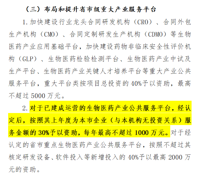 對于已建成的運(yùn)營的生物醫(yī)藥產(chǎn)業(yè)公共服務(wù)平臺,予以資金支持。