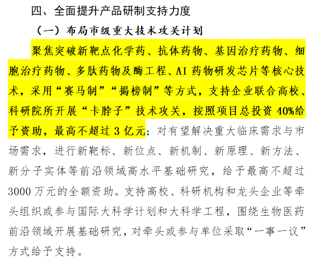 聚焦突破新靶點(diǎn)化學(xué)藥、抗體藥物、基因治療藥物、細(xì)胞治療藥物、多肽藥物及酶工程、AI藥物研發(fā)芯片等核心技術(shù),采用“賽馬制”“揭榜制”等方式,支持企業(yè)聯(lián)合高校、科研院所開展“卡脖子”技術(shù)攻關(guān),按照項(xiàng)目總投資40%給予資助,最高不超過3億元。
