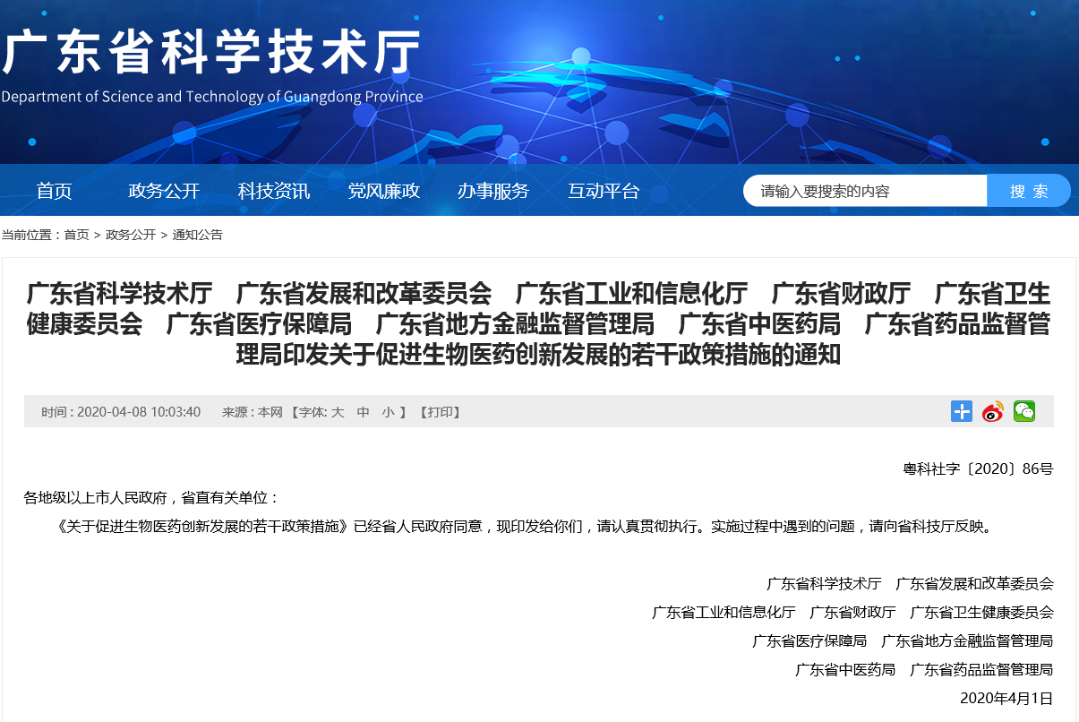 2020年4月8日,廣東省科學(xué)技術(shù)廳、廣東省發(fā)展和改革委員會(huì)、廣東省工業(yè)和信息化廳、廣東省財(cái)政廳、廣東省衛(wèi)生健康委員會(huì)、廣東省醫(yī)療保障局、廣東省地方金融監(jiān)督管理局、廣東省中醫(yī)藥局、廣東省藥品監(jiān)督管理局等九部門聯(lián)合印發(fā)《關(guān)于促進(jìn)生物醫(yī)藥創(chuàng)新發(fā)展的若干政策措施》(以下簡稱《措施》),致力于提升生物醫(yī)藥原始創(chuàng)新能力和國際競爭力,推動(dòng)生物醫(yī)藥科技和產(chǎn)業(yè)高質(zhì)量發(fā)展,提高生物安全治理能力。