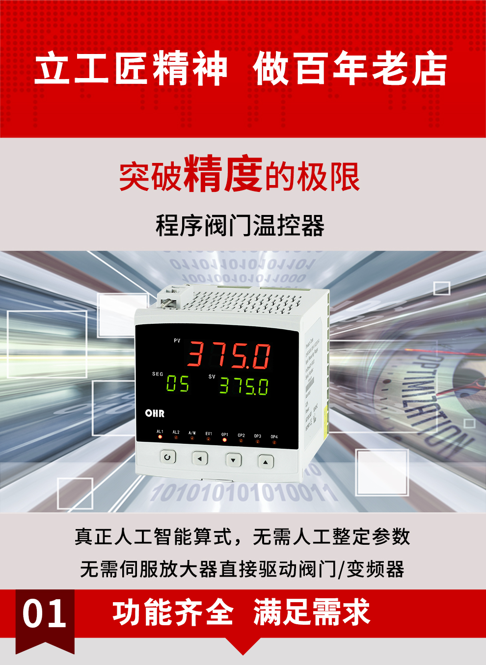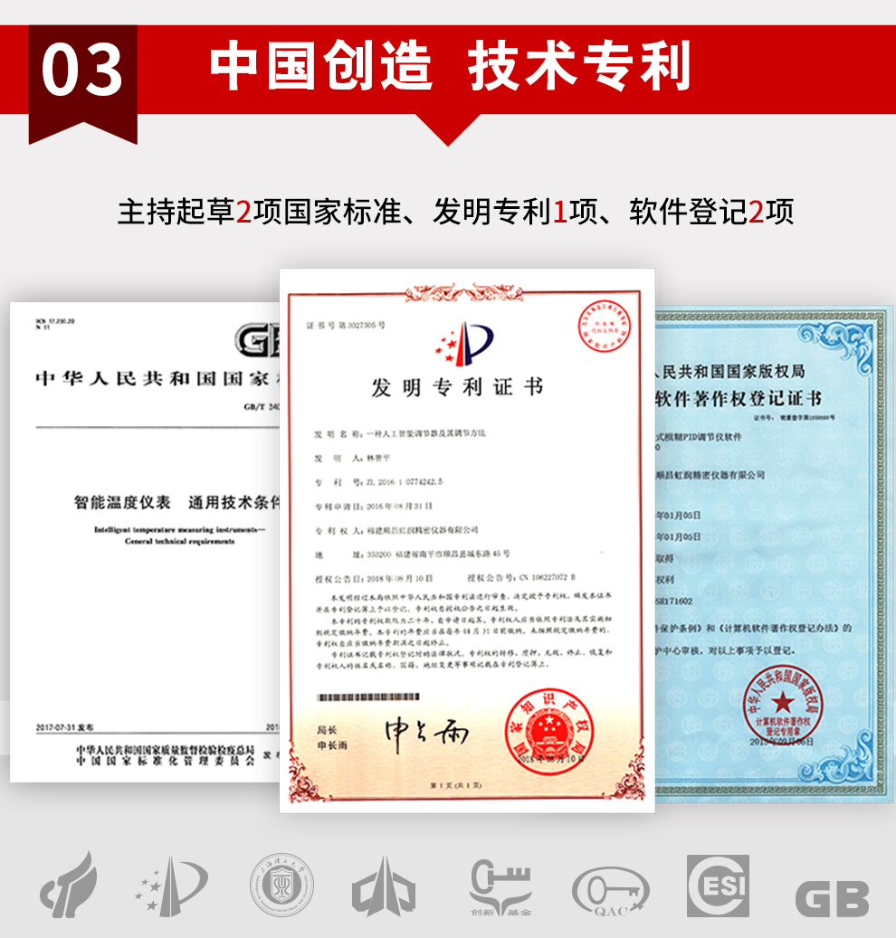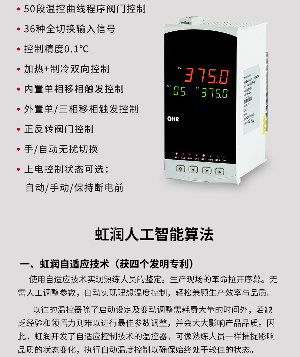 虹潤(rùn)公司是專業(yè)生產(chǎn)溫控器的國(guó)家專精特新“小巨人”企業(yè)。生產(chǎn)的程序閥門溫控器,具有50段溫控程序控制,真正人工智能算式,無(wú)需人工整定參數(shù),控制精度可達(dá)±0.1°C,加熱制冷雙向控制等特點(diǎn)。產(chǎn)品獲得模糊PID控制儀及控制方法、人工智能調(diào)節(jié)器、智能化控制器、移相觸發(fā)控制器、閥門自動(dòng)手動(dòng)無(wú)擾動(dòng)操作控制方法及裝置等5項(xiàng)國(guó)家發(fā)明專利,主持起草智能溫度儀表通用技術(shù)條件、工業(yè)過程控制系統(tǒng)用模擬輸入兩位或多位輸出儀表、工業(yè)過程測(cè)量和控制系統(tǒng)用智能調(diào)節(jié)器等3項(xiàng)國(guó)家標(biāo)準(zhǔn),,以及通信系統(tǒng)多通道數(shù)據(jù)采集控制終端規(guī)范軍用標(biāo)準(zhǔn),參與國(guó)際5G標(biāo)準(zhǔn)制定,取得增強(qiáng)型分段調(diào)節(jié)器等3項(xiàng)相關(guān)軟件著作權(quán)。產(chǎn)品廣泛應(yīng)用于電力、石化,冶金、制藥、食品等幾乎所有工業(yè)現(xiàn)場(chǎng),實(shí)現(xiàn)精準(zhǔn)控溫,保障生產(chǎn)安全與質(zhì)量。