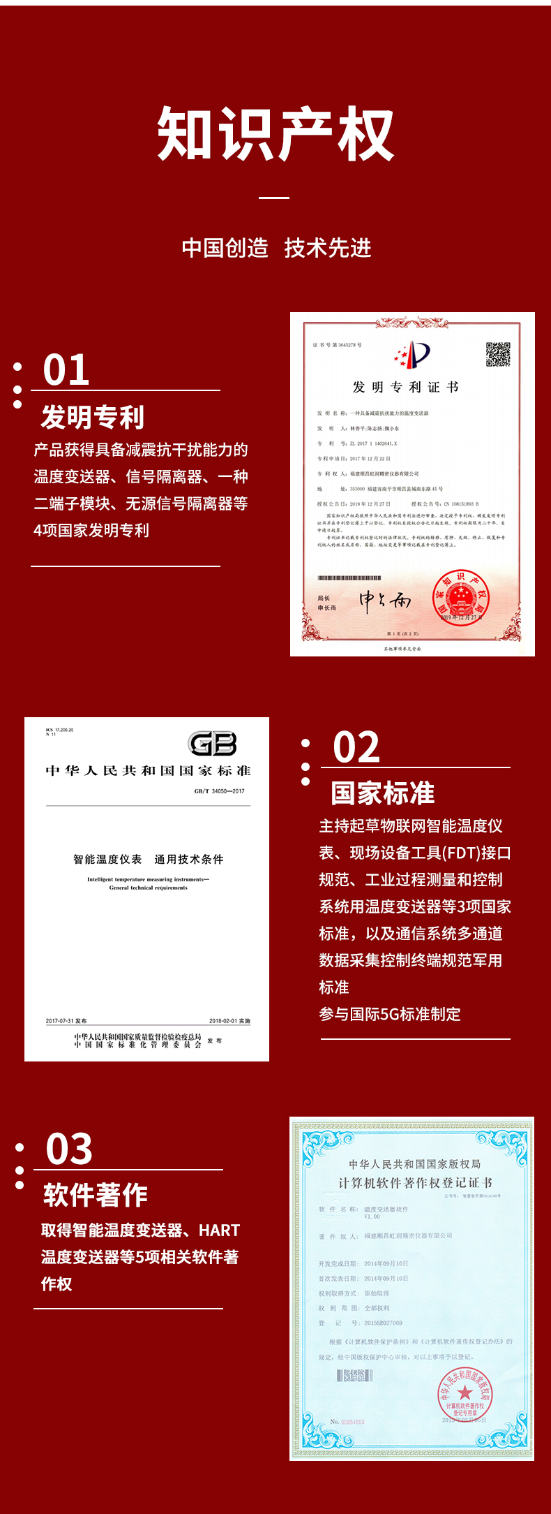 虹潤公司是專業(yè)生產(chǎn)溫度變送器的國家專精特新“小巨人”企業(yè)。生產(chǎn)的智能溫度變送器,具有適配各類溫度傳感器,精度高,穩(wěn)定性好,通過編程線修改輸入信號類型及量程,高抗干擾等特點(diǎn)。該產(chǎn)品不僅通過HART基金會(huì)認(rèn)證、德國萊茵 CE 認(rèn)證與 SIL 功能安全認(rèn)證,還獲得具備減震抗干擾能力的溫度變送器、信號隔離器、一種二端子模塊、無源信號隔離器等4項(xiàng)國家發(fā)明專利,主持起草物聯(lián)網(wǎng)智能溫度儀表、現(xiàn)場設(shè)備工具(FDT)接口規(guī)范、工業(yè)過程測量和控制系統(tǒng)用溫度變送器等3項(xiàng)國家標(biāo)準(zhǔn),以及通信系統(tǒng)多通道數(shù)據(jù)采集控制終端規(guī)范軍用標(biāo)準(zhǔn),參與國際5G標(biāo)準(zhǔn)制定,取得智能溫度變送器、HART溫度變送器等3項(xiàng)相關(guān)軟件著作權(quán)。產(chǎn)品廣泛應(yīng)用于石油、化工、電力、冶金、制藥、食品、水處理等各種工業(yè)領(lǐng)域。
