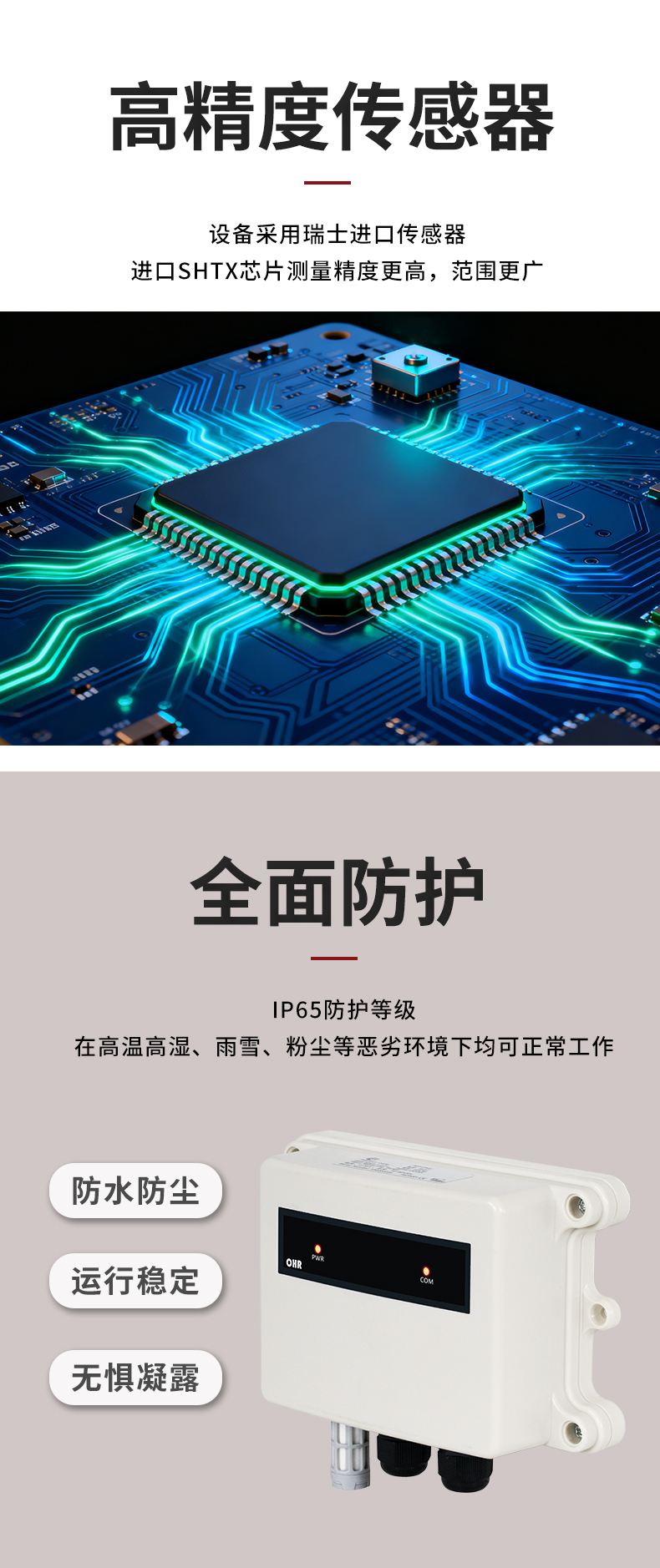 虹潤公司是專業(yè)生產環(huán)境監(jiān)測儀表的國家專精特新“小巨人”企業(yè)。生產的一體式溫濕度變送器,具有溫度、濕度、露點高精準的測量與變送,報警繼電器輸出,RS485/RS232通訊,IP65防護等級等特點。產品獲得一種手持式低功耗溫濕度檢測儀、大屏幕溫濕度記錄儀等2項國家發(fā)明專利,主持起草物聯(lián)網智能溫度儀表通用技術條件、冷鏈溫度記錄儀等2項國家標準,以及通信系統(tǒng)多通道數(shù)據(jù)采集控制終端規(guī)范軍用標準,以及現(xiàn)場設備集成等5項智能制造國家標準,參與國際5G標準制定,取得溫濕度儀表等3項相關軟件著作權。產品廣泛應用于工業(yè)現(xiàn)場、農業(yè)大棚、倉儲物流、地下管廊、養(yǎng)殖孵化、配電機房等諸多領域。