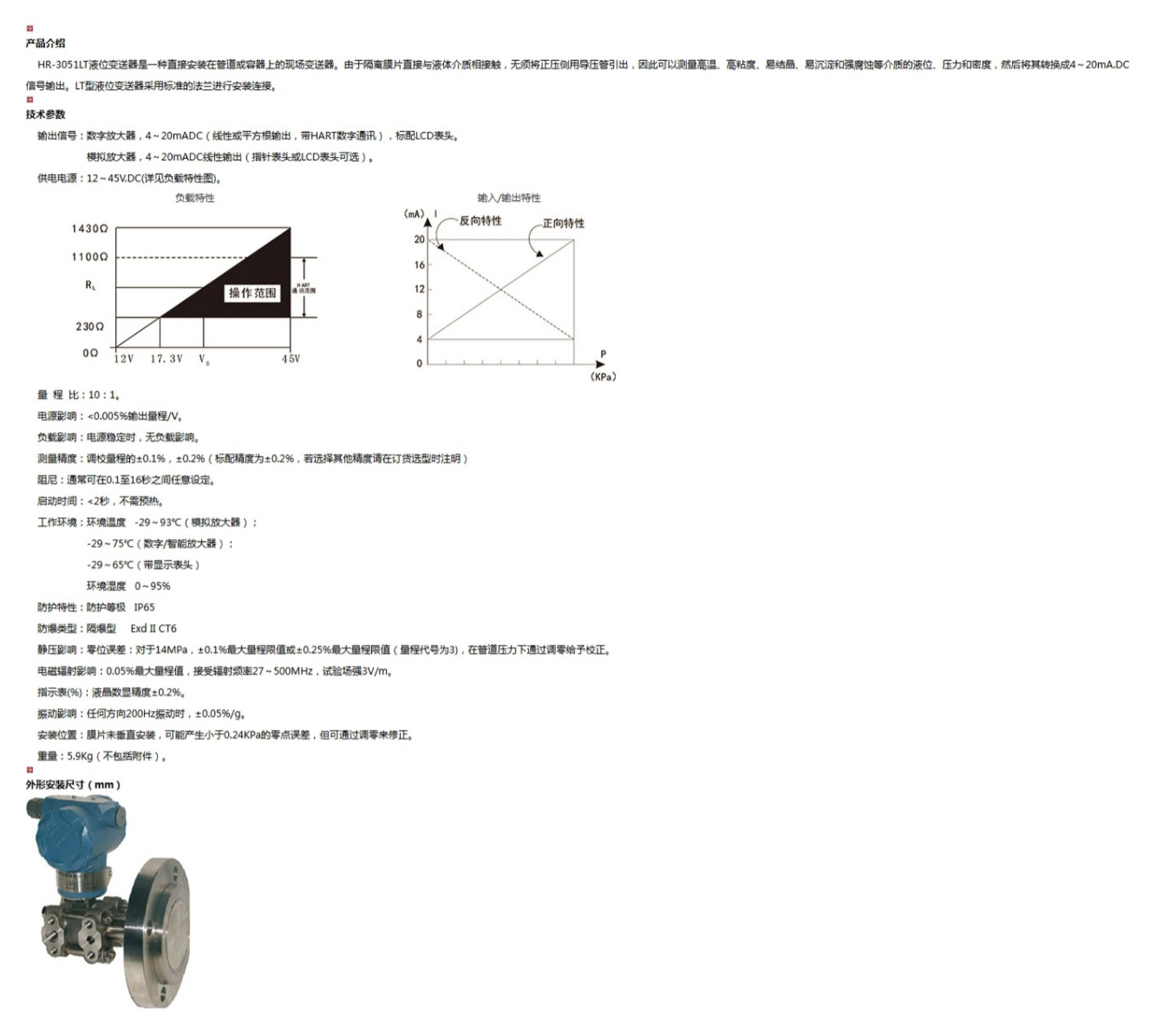 HR-3051LT液位變送器是一種直接安裝在管道或容器上的現(xiàn)場變送器。由于隔離膜片直接與液體介質(zhì)相接觸,無須將正壓側(cè)用導(dǎo)壓管引出,因此可以測量高溫、高粘度、易結(jié)晶、易沉淀和強腐蝕等介質(zhì)的液位、壓力和密度,然后將其轉(zhuǎn)換成4~20mA.DC信號輸出。